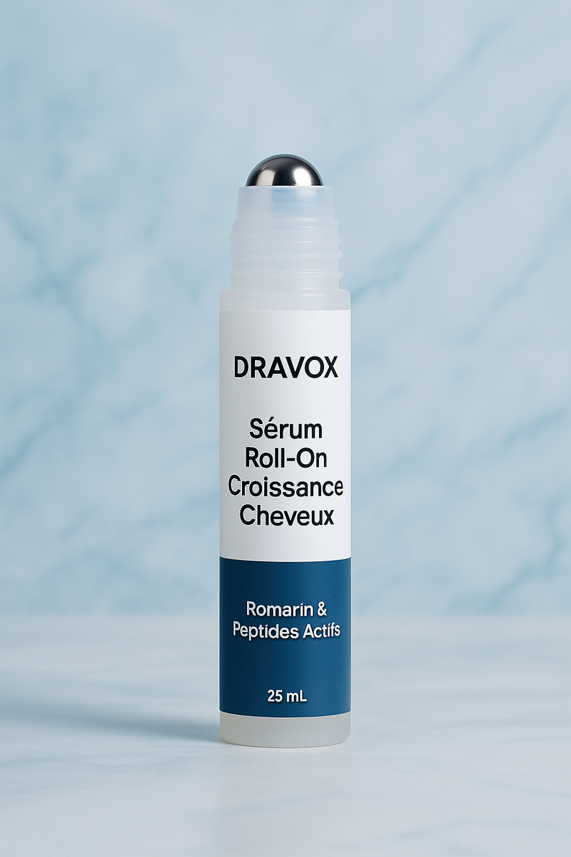 DRAVOX™ agit directement à la racine grâce à une formule puissante au romarin + peptides, reconnue pour booster la croissance et renforcer chaque poil.